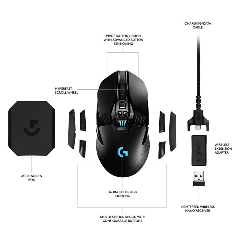 دارای نرم افزار اختصاصی Logitech G HUB جهت تغییر DPI یا شخصی سازی عملکرد کلیدها، مجهز به پردازنده 32 بیت ARM، قابلیت شارژ بی سیم (با داک مخصوص)، فناوری LightSpeed برای تاخیر کم، کفی تفلون (PTFE)